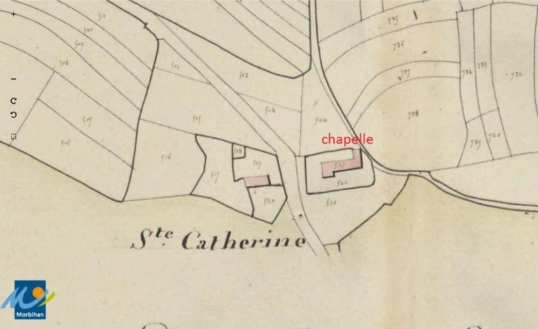 La foire du 11 avril attirait à la chapelle Sainte-Catherine une foule impressionnante. Cet ancien prieuré passe pour une fondation hospitalière des Templiers installés non loin de là : les lieux-dits voisins (la Grée aux moines, le Temple) - portent des noms évocateurs. La chapelle est reconstruite après un incendie, en reprenant le plan primitif caractéristique des constructions des Templiers : un mur de refend, percé d'une arcade, sépare le chœur de la nef et rappelle la clôture monastique. Côté nef, à gauche et à droite de l'arcade les autels ont disparu. Au cours de la seconde moitié du 17e siècle, on installa un retable en bois. Le lambris porte l´inscription : " LAN 1771 FAIT PAR JOSEPH LEGAL ET MATHURIN FABLET ". Dans le retable prit place en 1874 un tableau représentant sainte Catherine d'Alexandrie, peint par Pobeguin dont on connaît par ailleurs une toile d'ex-voto marin conservée à Sainte-Anne d'Auray ; à la même époque, un autre tableau fut placé au-dessus : peint par Ch. Piacentini, de Vannes, il met en scène la rencontre de Templiers et de Croisés. La sacristie est datée de 1722.