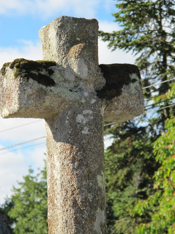 Croix monolithe sur socle et soubassement de maçonnerie ; fût de section carrée chanfreiné à griffes. Décor sur la face principale : Christ en croix.