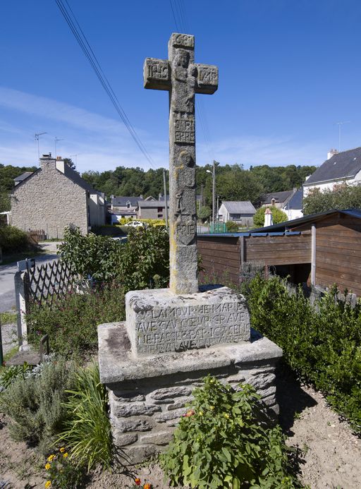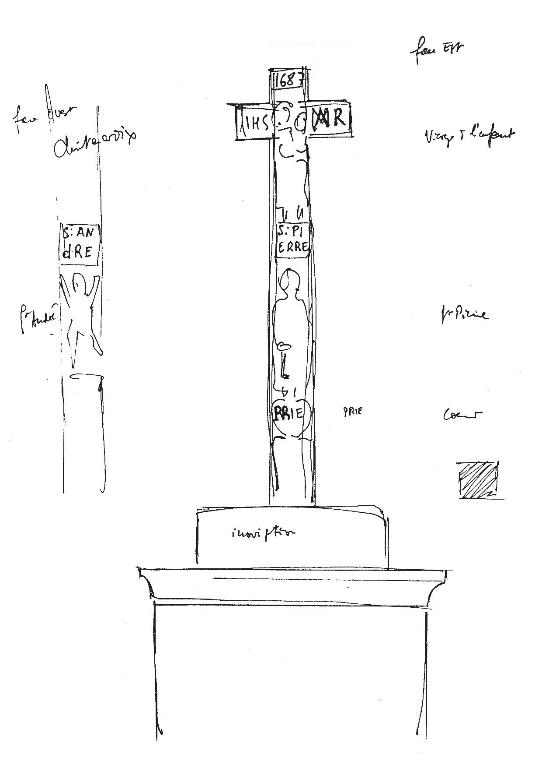 Croix monolithe, sur socle et soubassement. Décor en demi-relief. Sur la face principale : Christ en croix, les pieds cloués l'un sur l'autre ; Martyre de saint André ; inscription difficilement lisible, sur le socle : CETTE CROIX [..]. Sur la face portant la Vierge à l'Enfant : date 1687 / IHS et AM sur les branches de la croix ; S. PIERRE ; représentation de saint Pierre portant les clés ; cœur gravé de : PRIE ; inscription sur le socle.