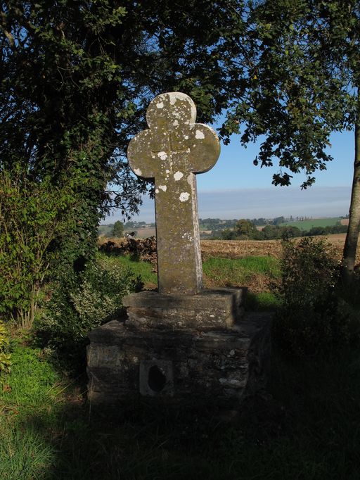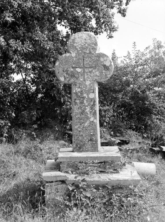 Croix palis monolithe sur un soubassement de maçonnerie ; en schiste violet, trilobée et chanfreinée en cavet sur les deux faces. Décor de la face principale : sur la croix, une croix grecque gravée en réserve.