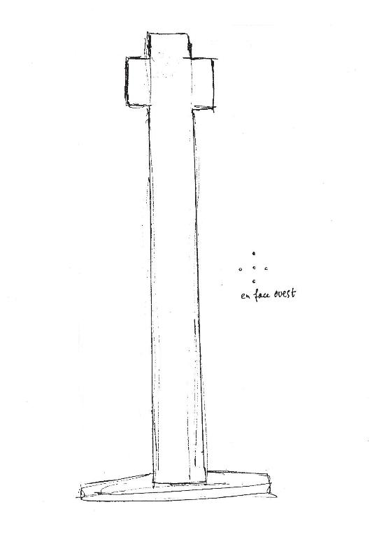 Croix palis, monolithe, sur socle. Décor : des trous symbolisant les cinq plaies du Christ.
