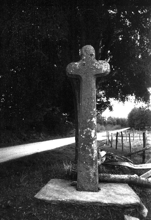 Croix palis monolithe, trilobée, sur socle. Décor : des trous symbolisant les cinq plaies du Christ ; croix gravée.
