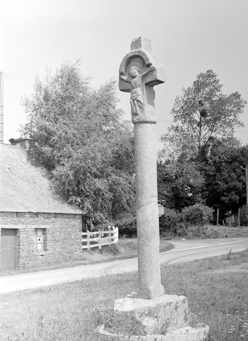 Croix à dais, sur socle cubique et emmarchement circulaire ; fût de section circulaire. Décor en haut-relief ; sur une face : Christ en croix ; sur l'autre face : Vierge à l'Enfant.