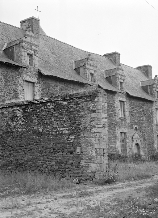Élévation sud du logis à travée ; la porte en arc plein cintre à pilastres et fronton est décalée à droite de la partie centrale. Au droit des deux murs de refend, trace de reprise verticale indiquant une construction en deux temps, sans qu'on puisse parler de deux campagnes car le style des baies et des lucarnes est identique dans la partie centrale et dans les parties latérales.