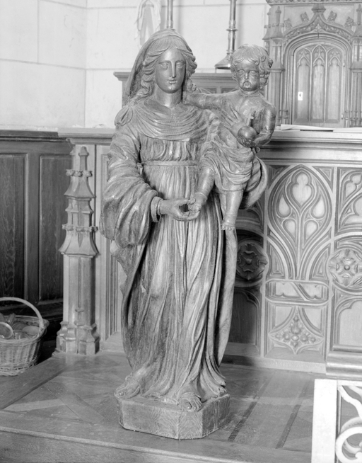 Croix à bâtière sur socle et soubassement de maçonnerie. Décor en demi-relief ; sur une face : Christ en croix ; sur l'autre face : Vierge à l'Enfant couronnée.