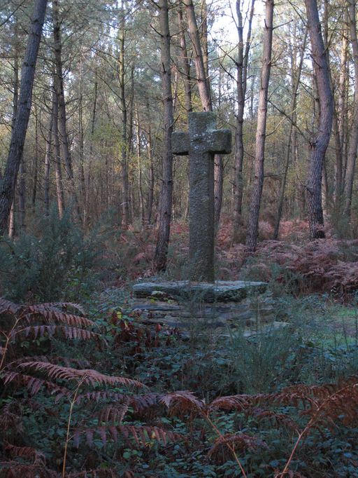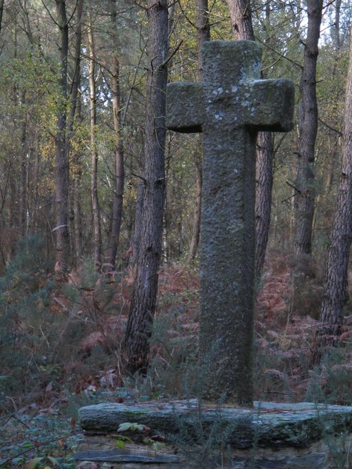 Croix monolithe en granite sur soubassement de maçonnerie couvert d'une dalle de schiste et reposant sur un emmarchement à deux degrés ; fût de section rectangulaire. Décor gravé sur le fût : IHS.