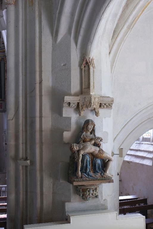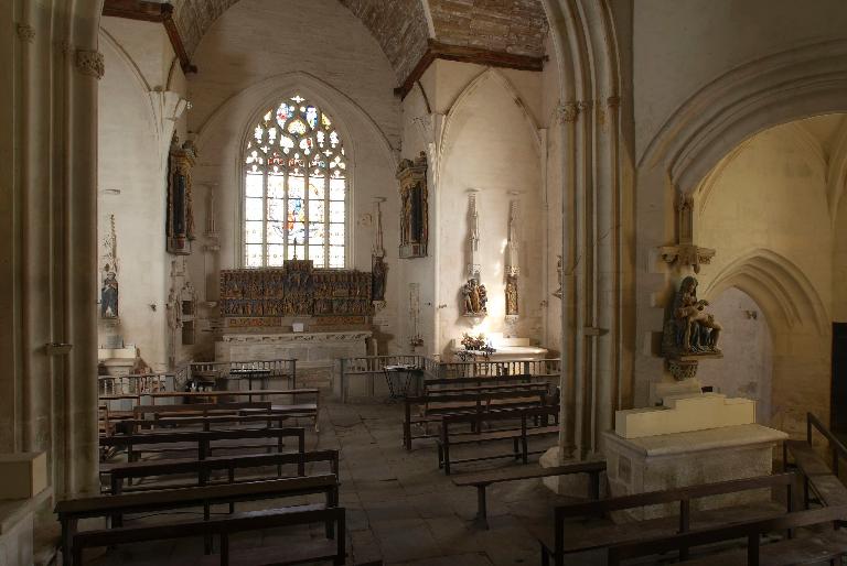 L´édifice présente un plan en croix latine avec un chœur de faible profondeur terminé par un chevet plat. La nef est flanquée dans sa partie orientale de deux bas-côtés que la présence d´autels adossés aux piles de l´arc triomphal doit plutôt amener à interpréter comme des chapelles privatives, dotées d´accès distincts. Dans sa partie ouest, elle se réduit à un vaisseau unique, séparé du reste de l´édifice par un chancel en bois qui peut remonter au 15e siècle. Deux autres autels y sont adossés. La présence du clocher porche du 18e siècle ne permet pas de connaître les dispositions d´origine de la façade ouest. Deux phases de construction se distinguent assez clairement. À la première, appartiennent le chœur, le transept et l´arc triomphal, élevés dans le deuxième tiers du 15e siècle, conformément à l'inscription datée de 1435 présente dans le mur du chevet, à droite de la maitresse vitre. Outre les données de l´héraldique, une datation autour de 1450 est confirmée par le mélange, dans les fenestrages du chevet et du bras nord du transept, des répertoires rayonnant et flamboyant : ainsi, la maîtresse-vitre superpose une série de cinq lancettes tréflées surmontées d'un rang de trilobes aux pointes effilées et un réseau garni de mouchettes. De même, les nervures de l´arc triomphal retombent sur de fines colonnettes à chapiteaux, également présentes dans les piédroits des baies, type de support qui tend à disparaître dans la seconde moitié du siècle. Cette partie présente à l´intérieur un appareil mixte où alternent des assises allongées de schistes et de grès. Le chœur, la croisée et les bras du transept conservent des arcs formerets et des départs de voûtes qui ont pu faire croire à un projet, abandonné, de couvrement en pierre. Cette thèse ne résiste guère à l´examen, compte tenu de l´extrême minceur des supports (des colonnettes baguées d´un petit chapiteau de feuillage recevant en pénétration les départs de nervures prismatiques au-dessus de celui-ci) et de la faiblesse des contreforts à l´extérieur. On peut en revanche imaginer que les tas-de-charge avaient été conçus pour servir d´assise à de fausses voûtes d'ogives en bois, d´un usage répandu en Angleterre et dans les Pays-Bas, et dont la Bretagne conserve quelques exemples du 16e siècle. La même particularité se retrouve d´ailleurs à Saint-Fiacre du Faouët, qui s´élève au même moment. Conformément aux conceptions de l´espace liturgique prévalant à la fin du Moyen Âge, le choeur et le transept, avec les trois autels adossés à leur mur est, forment un volume homogène, dont l´unité est encore renforcée par le mobilier intégré (armoire eucharistique, lavabos à crédence, niches). Il faut souligner le raffinement de ce dernier.