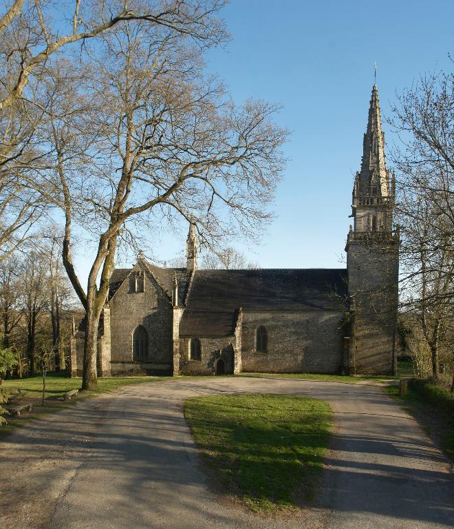 Distante de 3 km de la ville de Pontivy dont elle relève aujourd’hui, la chapelle était autrefois située sur la paroisse de Noyal-Pontivy, la plus étendue du diocèse de Vannes, célèbre par ses foires franches établies par les vicomtes de Rohan : celle de la Houssaye, en septembre, durait dix jours. C´est donc au coeur de ses domaines qu´Alain IX (vers 1382-1462), qui menait à l´instar de son beau-frère le duc Jean V une active politique de mécénat, entreprend de construire la chapelle. Le début du chantier est daté de 1435 par une inscription incrustée dans le mur sud du choeur. Parmi les blasons figurant au tympan de la maîtresse-vitre, on relève, dans les deux ajours centraux du second rang, les hermines de Bretagne seules et un parti de Bretagne et d´Écosse, correspondant à l´alliance d´Isabelle d´Écosse avec François Ier en 1441. Duc en 1442, ce dernier meurt en 1450, ce qui donnerait un terminus ad quem plausible au chevet. Le parti de Rohan et de Bretagne présent dans un trilobe du registre inférieur peut rappeler le mariage en 1407 d´Alain IX avec Marguerite, fille de Jean IV, aussi bien que celui, célébré en 1461, de Jean II de Rohan avec Marie de Bretagne, fille de François Ier. Les difficultés financières que connaît Alain IX autour de 1450, et qui le contraignent à hypothéquer ou à céder plusieurs de ses seigneuries, expliquent peut-être un ralentissement, sinon une interruption des travaux. Ceux-ci reprennent dans le dernier quart du 15e siècle, sans doute à l´initiative de Jean II de Rohan, qui dote la chapelle d´un somptueux mobilier. Les remplages fleurdelysés des baies du bas-côté sud et du mur nord de la nef correspondent bien à une campagne autour de 1500. En 1730, on entreprend à l´ouest la construction d´un clocher porche classique, dont le second étage est achevé en 1779. Enfin, le 19e siècle voit la création de la flèche néo-gothique.