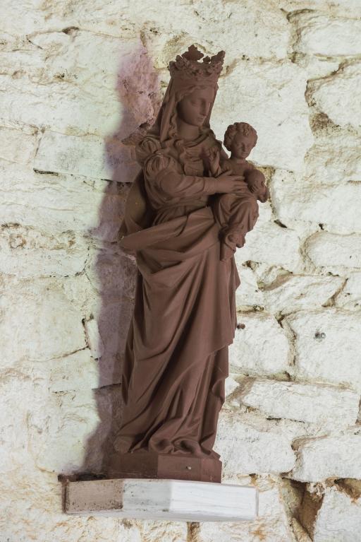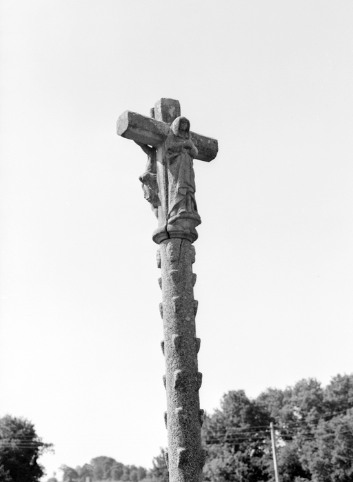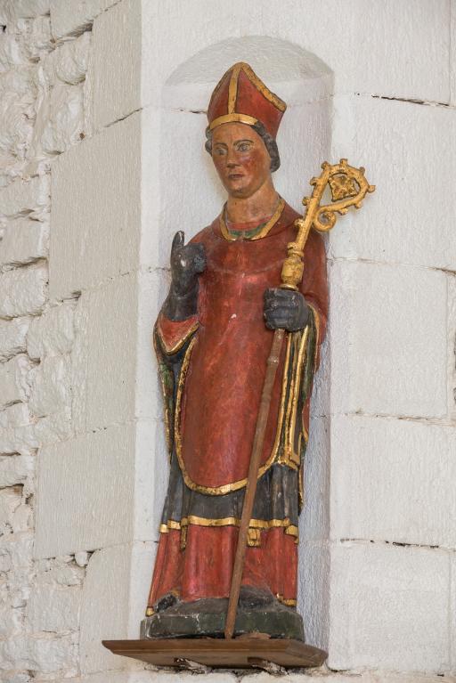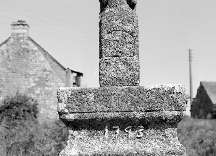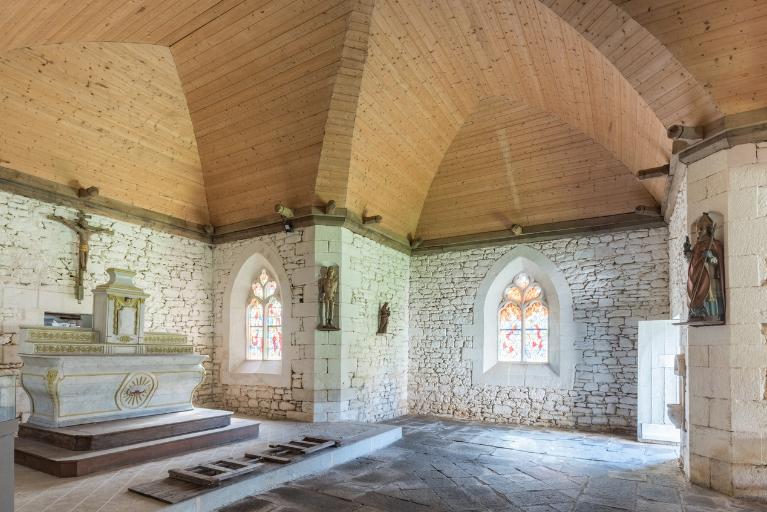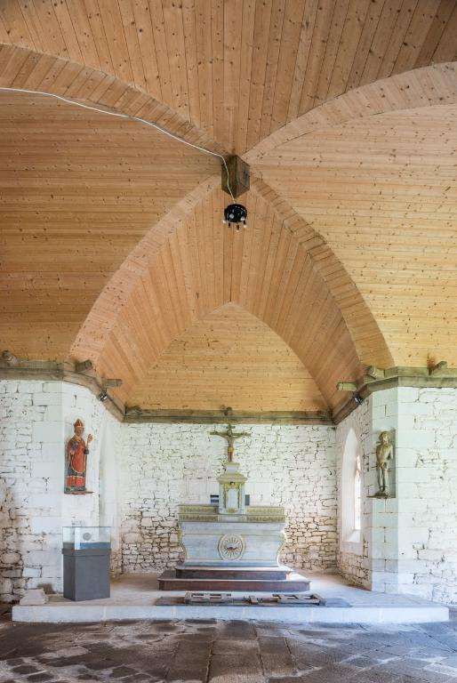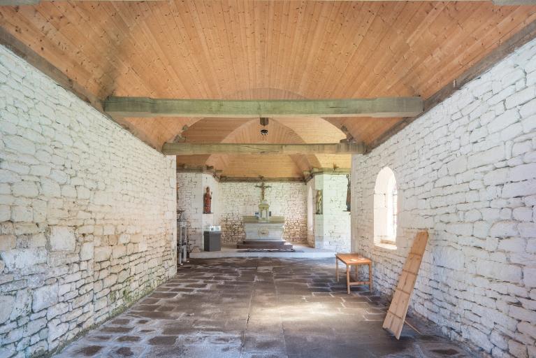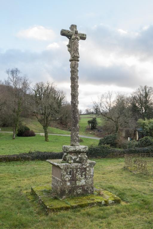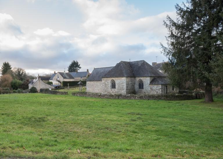 Nef 3e quart 17e siècle avec charpente portant la date 1662. Transept, choeur et sacristie réédifiés vers 1866 (daté par source), avec remplois de baies, 2e moitié 15e siècle. Croix composite à soubassement portant la date 1743. Base du fût portant la date 1810. Fontaine pouvant dater du 18e siècle. Vestiges de vitraux signalés par Rosenzweig en 1863, avec armes des Rohan et autre blason d'argent à trois fasces de gueules non identifié.