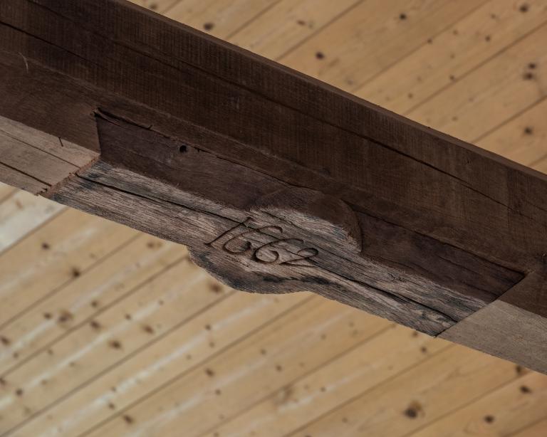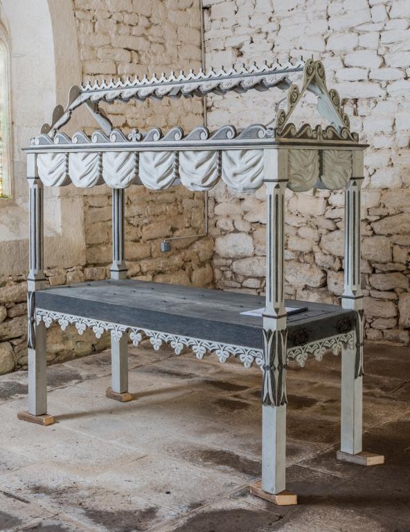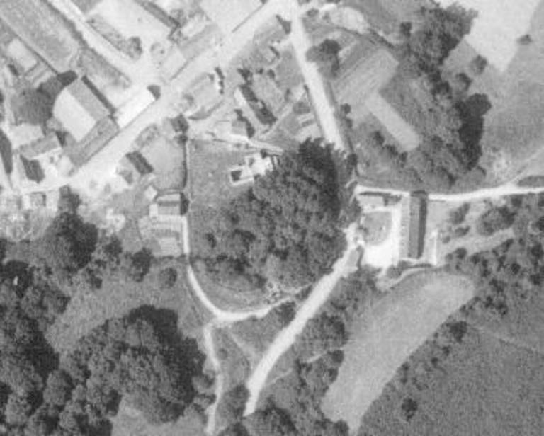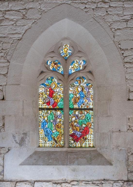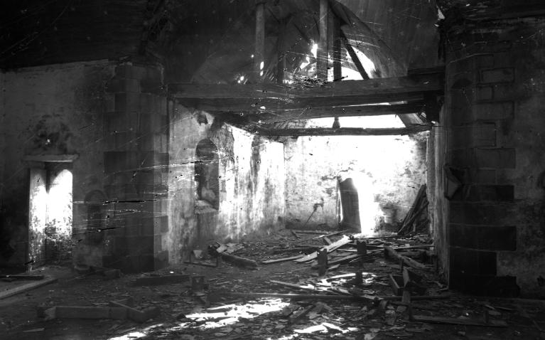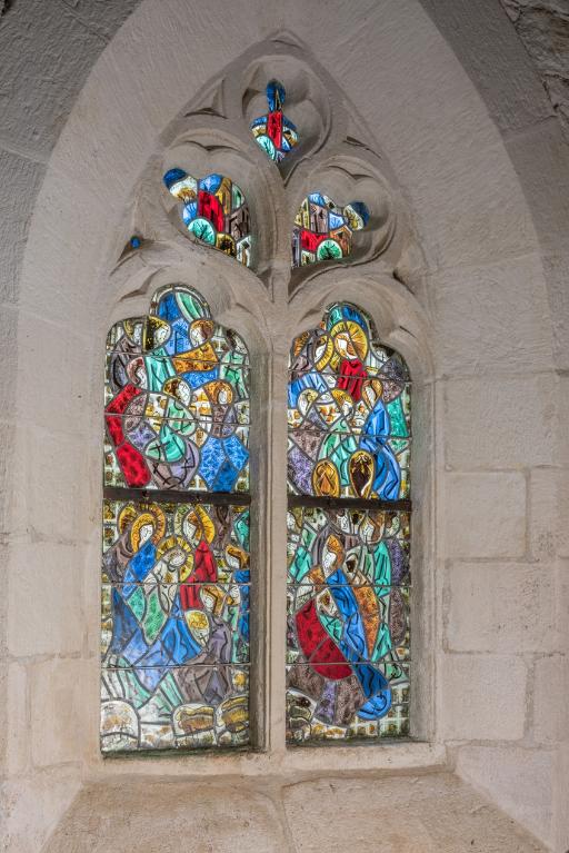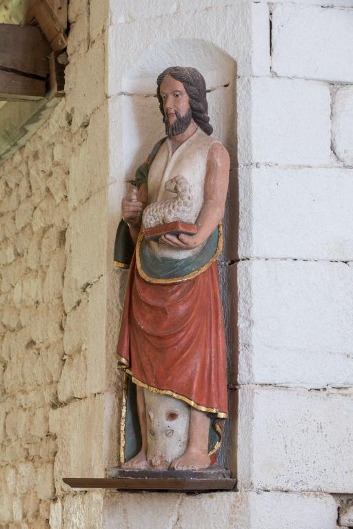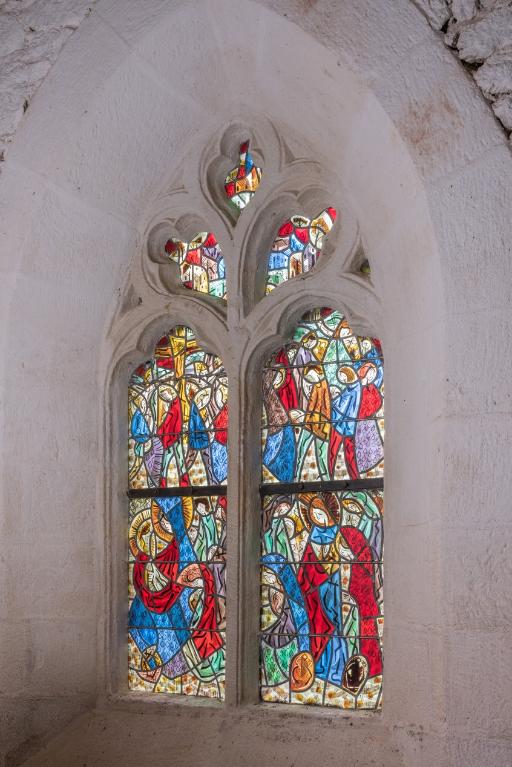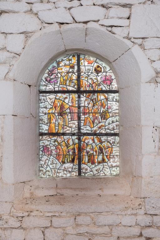 Nef 3e quart 17e siècle avec charpente portant la date 1662. Transept, choeur et sacristie réédifiés vers 1866 (daté par source), avec remplois de baies, 2e moitié 15e siècle. Croix composite à soubassement portant la date 1743. Base du fût portant la date 1810. Fontaine pouvant dater du 18e siècle. Vestiges de vitraux signalés par Rosenzweig en 1863, avec armes des Rohan et autre blason d'argent à trois fasces de gueules non identifié.