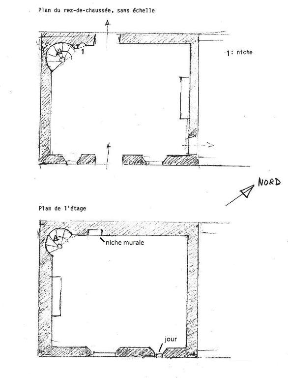 À l'ouest de l'alignement. Plan massé proche du carré ; escalier en vis en bois dans œuvre dans l’angle nord-ouest ; sol en terre battue, cheminée sur le mur mitoyen droit, petite niche à étagères à droite de l'escalier, porte au nord face à la porte d'entrée.