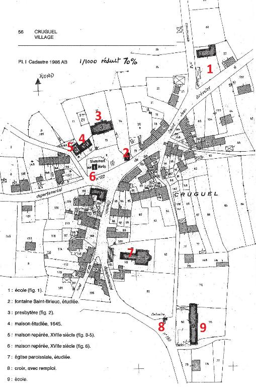 * Le changement principal concerne la place centrale où s'élevait l'église ancienne, détruite à partir de 1876 et qui a été reconstruite, à partir de 1874, sur une parcelle libre (608) du cadastre ancien. La place ainsi dégagée a été aménagée vers 1900 (A. D. Morbihan. Série 3 E 51/74 : établissement d'une place publique sur l'emplacement de l'ancien cimetière, 1900) et a reçu en 1904 un grand calvaire ; le monument aux morts y a été placé en 1929 (même référence). Le nouveau cimetière est installé sur la route de Sainte-Yves, à l'ouest du village.