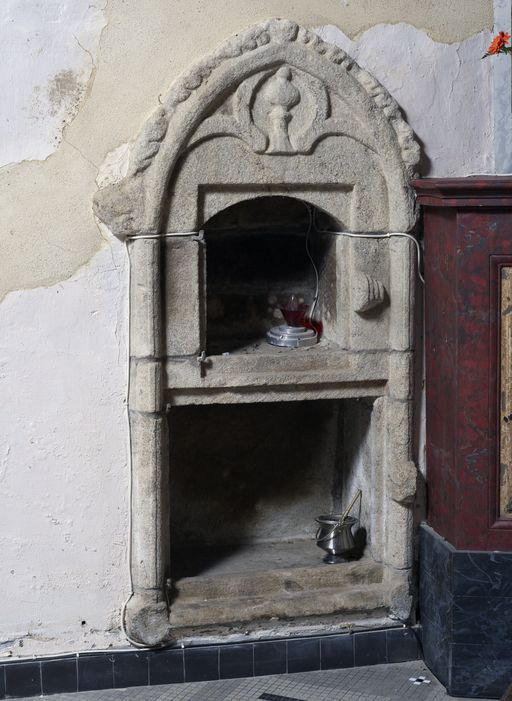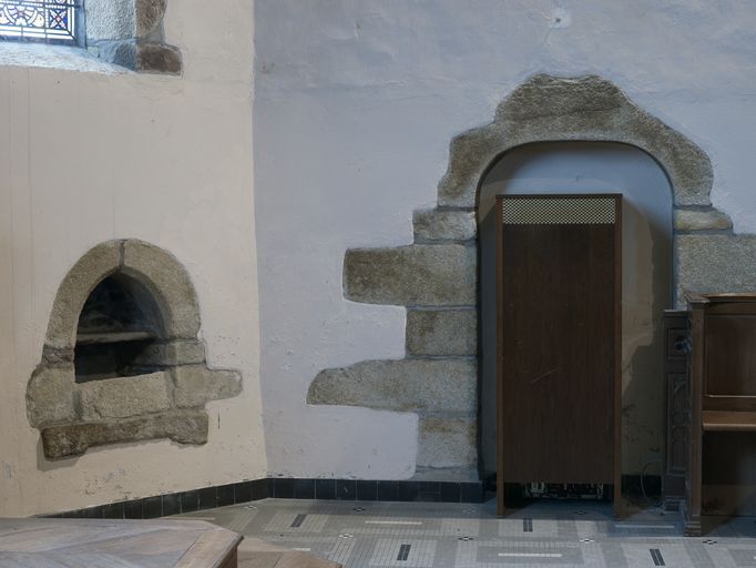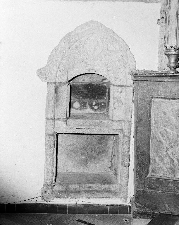 Dans le porche ouest, inscription gravée sur une pierre : ..RECOUET / PER . MAIRE / EN 1790.