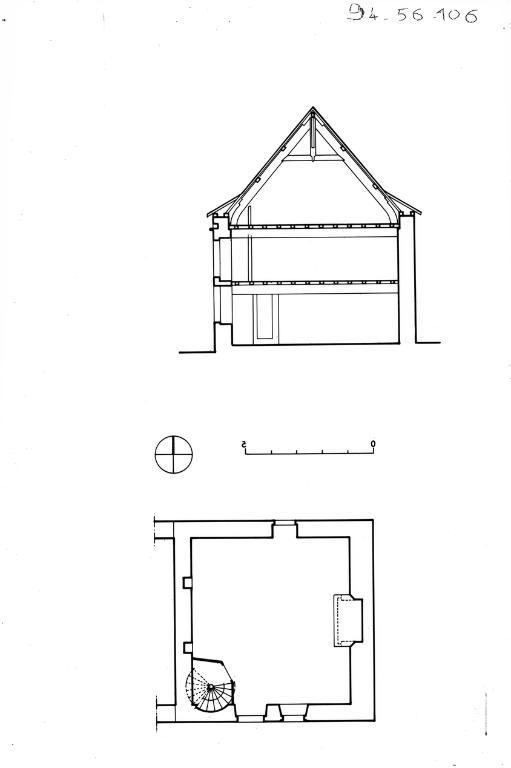 Le hameau, au nord de la commune, est assez développé et comprend plusieurs alignements de maisons dont la plupart sont désaffectées, parfois depuis longtemps reconverties en dépendances agricoles. Cette maison, qui date de la fin du 16e siècle ou du début du 17e, présente une structure qui est une variante du type à une pièce d'habitation par étage ; un escalier en vis dans l'angle, à droite de la porte d'entrée, dessert la pièce de l'étage et le comble. Les deux cheminées sont superposées sur le pignon gauche. La variante par rapport au type normal est apportée par la présence d'une porte haute ouvrant dans la pièce de l'étage, au lieu d'une simple fenêtre, ici placée dans le pignon à côté de la cheminée. Cette porte haute, qui semble d'origine, desservait-elle une partie "grenier" dans la chambre de l’étage, ou bien donnait-elle accès à ce niveau à l'escalier menant au grenier du comble ? La lecture des fonctions de logement et de stockage à l'étage de certaines maisons est souvent ambiguë et les termes de l'alternative sont variables : entre logement dominant et stockage secondaire, ou l'inverse, toutes les variantes sont possibles.