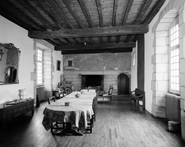 Le corps central en rez-de-chaussée comprend la salle du manoir séparée d´une autre pièce par un épais mur de refend. Cette salle, actuellement plafonnée, s´ouvrait à l´origine sur la charpente conservée dans le comble, selon le type appelé « salle basse sous charpente ». Dans le mur de refend est incorporée une vaste cheminée flanquée d´une porte à linteau sur coussinets ; les linteaux sont surmontés d´arcs de décharge ; la porte donne sur un escalier permettant de rejoindre une chambre à l´étage ; à gauche de la cheminée, la petite baie chanfreinée est un jour de surveillance de la salle à partir de cette chambre ; le judas permettait sans doute d´exercer une surveillance discrète de la salle, mais il permettait d´abord aux femmes, qui se tenaient le plus souvent dans la chambre, de participer à la vie du logis. Cette hypothèse est renforcée par la présence du coussiège qui rendait cette observation plus confortable ; ici, la situation dans le mur de refend, près de la cheminée, permet de profiter de la chaleur du conduit. Ces dispositions, coursière, salle sous charpente, cheminée incorporée et jour de surveillance sont caractéristiques du XVe siècle.
