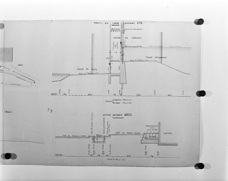 À partir de 1887, l’usine se développe et possède cinq turbines hydrauliques actionnant sept paires de meules pour écraser la paille de seigle hachée et chaulée (Nizan, p. 120-121). L’usine s’étend au site du Rouvray, en amont de Caradec. Plan et coupes de l’usine en 1887 (A. D. Morbihan, série S 1060).