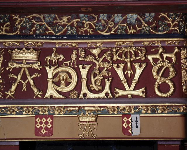 Sujet : personnages profanes affrontés, support : élévation antérieure ; sujet : ornement, entrelacs, monogramme AM, couronne, armoiries, support : élévation antérieure, lucarnes. Sujet : scène de chasse, vigne, animal fabuleux, couronne, support : rez-de-chaussée, cheminée ; armes des Rohan et des familles apparentées, devise a plus, support : cheminées et lucarnes.