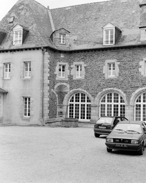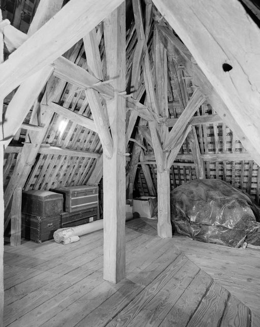 Charpente milieu 17e siècle conservée dans la partie nord ; trompes en cul-de-four à l'angle des corps de bâtiments ; cage d'escalier avec niches à luminaires.