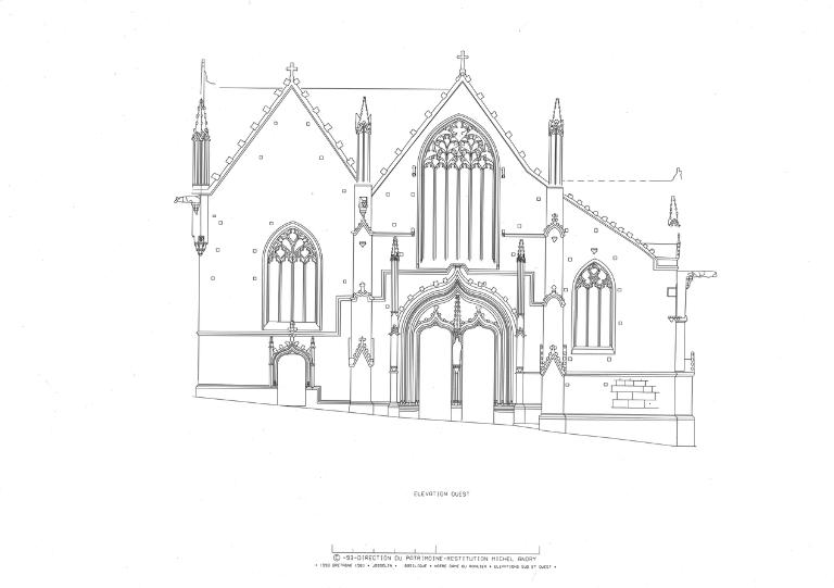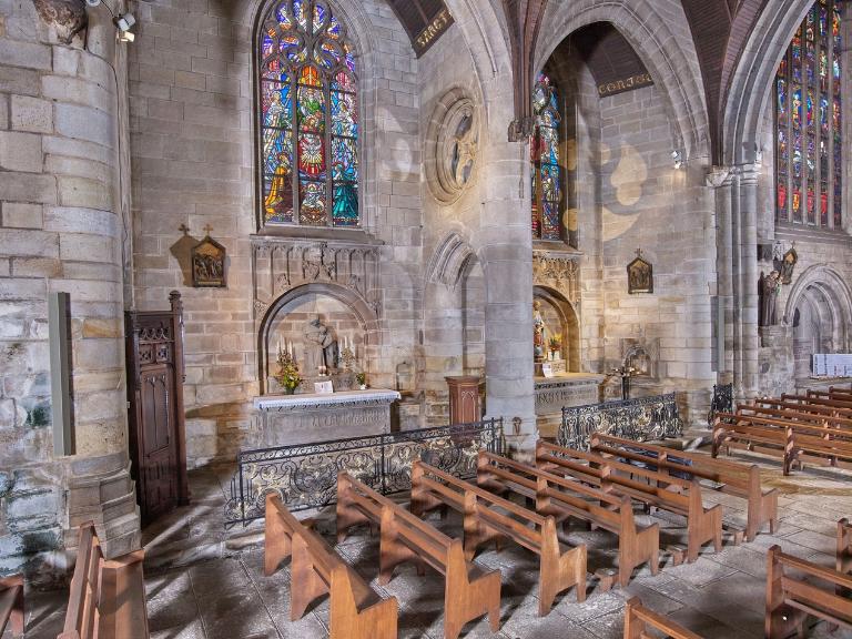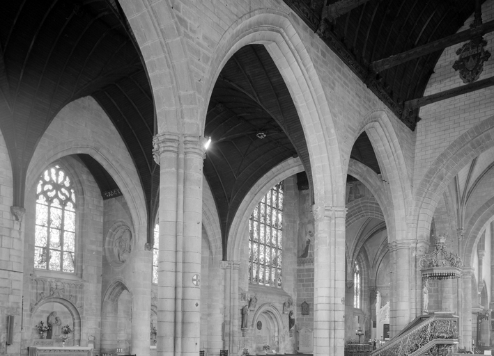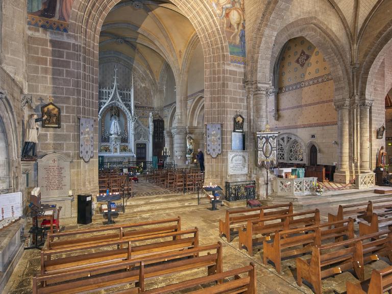 Les travaux commencent par la reconstruction en 1889-1890 du pilier sud-ouest de la croisée du transept, qui menace de s’effondrer, et des voûtes du transept et du chœur, sur les plans de l’architecte nantais René Michel Ménard (1843-1895), en charge de la restauration de la basilique. A la même période, la chapelle Sainte-Marguerite est restaurée avec le financement de la famille de Rohan. A partir d’avril 1891, on démolit la voûte de la nef, sans doute établie au début du XIXe siècle et on la remplace par une charpente lambrissée plus haute et plus conforme au mode de couvrement originel. Les sablières sont signées de la main du maître-menuisier josselinais Julien Hélé, qui réalise aussi parallèlement des architectures éphémères pour les fêtes du pardon, comme des arcs de triomphe et des estrades. L’année 1893 voit le démarrage d’une nouvelle campagne de travaux, destinée à transformer la chapelle nord, chapelle Sainte-Catherine en chapelle de pèlerinage, dédiée à Notre-Dame du Roncier et le bas-côté nord en « nef des pèlerinages », devant mener directement à la statue miraculeuse. Des verrières dont l’iconographie fait référence à plusieurs épisodes marquants de l’histoire du sanctuaire, comme la découverte de la statue ou des guérisons miraculeuses, sont mises en place. Ces aménagements et embellissements sont menés en prévision du 8 septembre 1893, date à laquelle on doit célébrer le 25e anniversaire du couronnement de la statue mais aussi la consécration de l’église et de l’autel Notre-Dame-du-Roncier deux années après l’obtention du statut de basilique. A partir de 1895, on reconstruit la sacristie, devenue trop étroite pour les grandes célébrations de la fin du XIXe s., sur les plans de René Michel Ménard et sous la direction des architectes nantais Lagaury (?-?) et Emile Libaudière (1853-1923) qui lui succèdent après sa disparition.