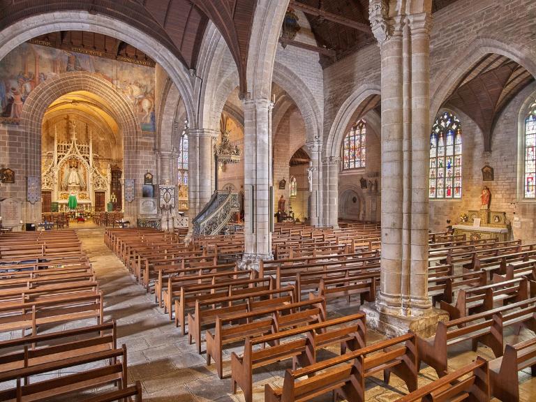La légende situe l’origine de l’église au IXe siècle, lorsqu’un laboureur découvre dans un buisson d’épines, une statue de la Vierge. Le paysan tente en vain de l’emporter mais elle revient toujours à l’endroit de sa découverte, qui sera plus tard le lieu d'édification d'une chapelle. Les premiers documents la désignent sous le nom de « Notre-Dame du château », en référence à celui de Guéthenoc, vicomte de Porhoët, qui a souhaité s’établir au plus près du lieu de l’apparition miraculeuse. L’attractivité du sanctuaire se confirme par la suite, lorsqu’Olivier de Clisson (1336-1407), connétable de France et comte de Porhoët, fait de la cité le lieu privilégié de la seigneurie de Rohan et ajoute un oratoire personnel en la chapelle Sainte-Marguerite, du nom de sa seconde épouse. Comme le souligne Roger Barrié, l’église reconstruite et agrandie entre la fin du XIVe siècle et le début du XVIe siècle est « propice à la fréquentation populaire » [1]. La circulation y est facilitée par un vaste plan rectangulaire. L’air et la lumière se propagent librement à l’intérieur de la nef, rythmée par ses files de piles élancées, supportant de hautes voûtes, dans l’esprit des église-halles [1]. Un évènement ponctuel telle la prédication de saint Vincent Ferrier à Josselin en 1419 comme le développement continu du pèlerinage ont probablement encouragé une telle conception de l’espace.