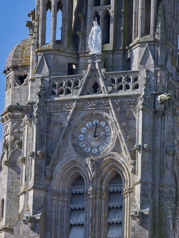 Un autre chantier de taille occupe ces maîtres d’œuvre à partir de 1899 : la construction d’une nouvelle tour, contre la face est de la chapelle Sainte-Catherine, rendue possible par un legs important, fait à la basilique pour son embellissement par une dénommée Aglaé Vallée. Dans une délibération du conseil de fabrique du 2 février 1899, les objectifs et motifs de ce projet sont clairement exposés. Il s’agit de détruire l’ancienne tour clocher « devenue inutile autant qu’encombrante » car empiétant largement sur le bas-côté nord menant à la nouvelle chapelle de pèlerinage et de construire une tour « convenable, en harmonie avec l’édifice » au chevet de la basilique. En 1901, la tour est bâtie jusqu’au départ de la flèche, les niveaux de la tribune, du crucifix monumental et de la chambre des cloches étant achevés. La tour, qui fait déjà 16m de haut, doit signaler aux alentours la présence insigne de la basilique, profitant de sa situation sur un point haut. Elle illustre une certaine volonté de rechristianisation de l’espace urbain, observée dans les grands centres de pèlerinage durant la seconde moitié du XIXe siècle. Mais un différent financier avec l’entrepreneur entraîne l’interruption du chantier en 1906 et laisse la tour inachevée jusqu’à 1945. Cette longue période de latence explique probablement pourquoi la tribune de cette tour n'a jamais été utilisée dans le cadre des pardons, et que la loggia de l'église Saint-Martin est encore préférée de nos jours.