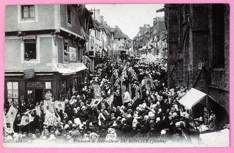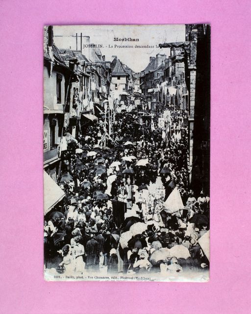 Morbihan. JOSSELIN. - La procession descendant la Place. Carte postale, Ch. Bailly, phot., Ploërmel : Vve Chamarre, édit., [1er quart 20e siècle].
