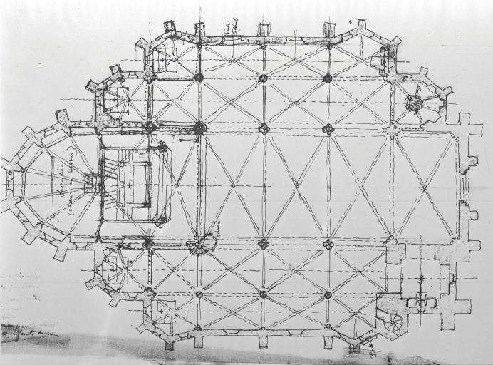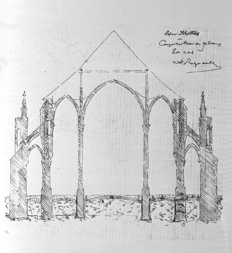 Façade absidiale, élévation, crayon sur papier, [s.d.], attribué à Arthur Regnault (A.D. d'Ille-et-Vilaine).