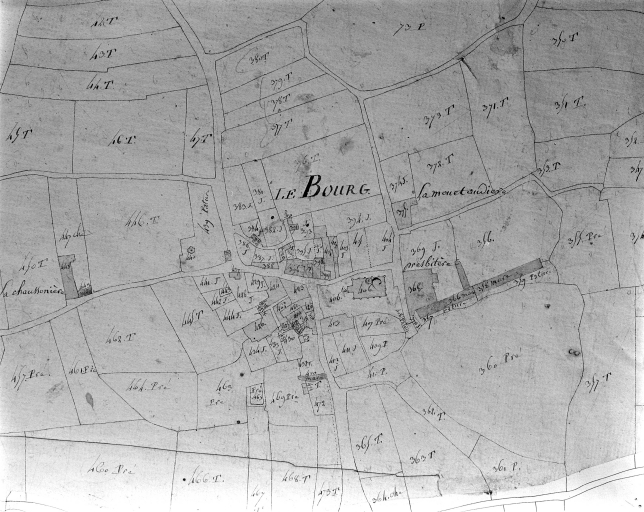 Plan géométrique parcellaire de la commune d'Etrelles, section B1 dite du Bourg, par Gazon géomètre, 1810, échelle 1/2500e (A. D. d'Ille-et-Vilaine : 3 P 5338).