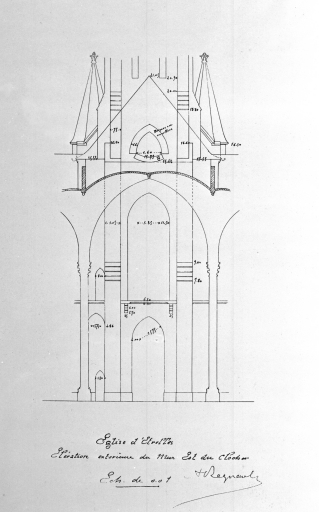 Elévation extérieure du mur est du clocher, gouache et encre de chine sur papier toilé, échelle 0,01, [s.d.], signé Arthur Regnault (A.D. d'Ille-et-Vilaine).