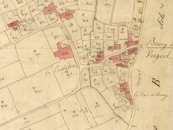 Plan géométrique parcellaire de la commune de Vergéal, section A dite du Bourg, par Geslin géomètre, Colliot arpenteur, Michel Robin maire, terminé le 15 décembre 1810, échelle 1/2500e (A. D. d'Ille-et-Vilaine : 3 P 5574).