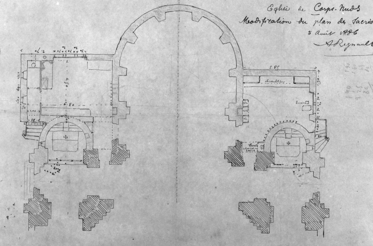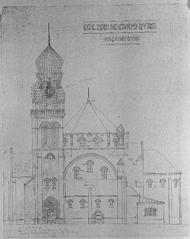L'église Saint-Pierre de Corps-Nuds constitue le prototype des églises romano-byzantines réalisées par Arthur Regnault. Son aspect extérieur et surtout son clocher orientalisant à bulbe se heurte dès les premières esquisses aux instances parisiennes. La composition monumentale est axée sur le volume central de la nef qui est recouvert d'une immense voûte d'ogives bombée qui sera reprise dans ses projets ultérieurs. L'emploi du mur écran fermant les grandes arcades de la nef est directement inspiré de Sainte-Sophie de Constantinople. Le répertoire décoratif et l'agencement du choeur sont influencés par le roman auvergnat, Issoire et Notre Dame du Port. Cette ambiance romano-byzantine est complétée par le mobilier et le décor dont le christ pantocrator, présent au cul-de-four de l'abside.