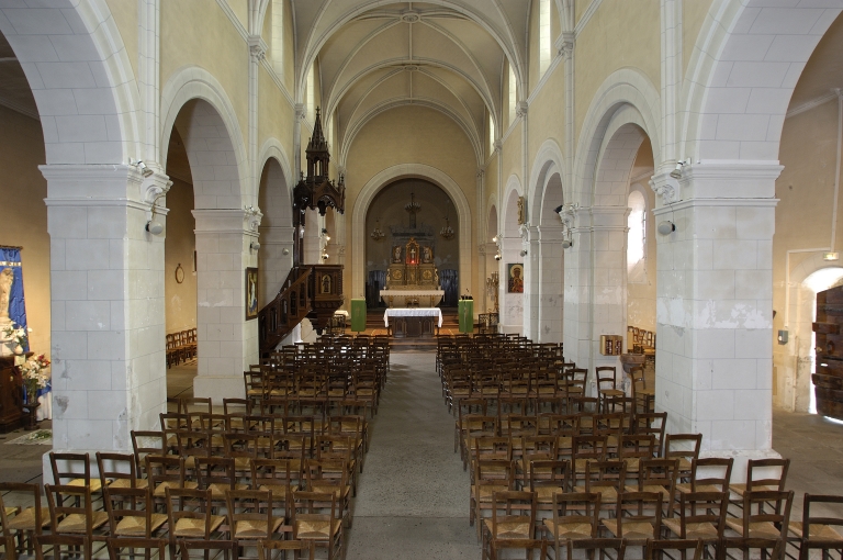 Plan en croix latine composé d'une nef et de deux bas côtés. Croisée du transept surmontée d'un clocher. Chevet arrondi. Contreforts plats de la période romane. Couvrement intérieur sur croisées d'ogives refait.