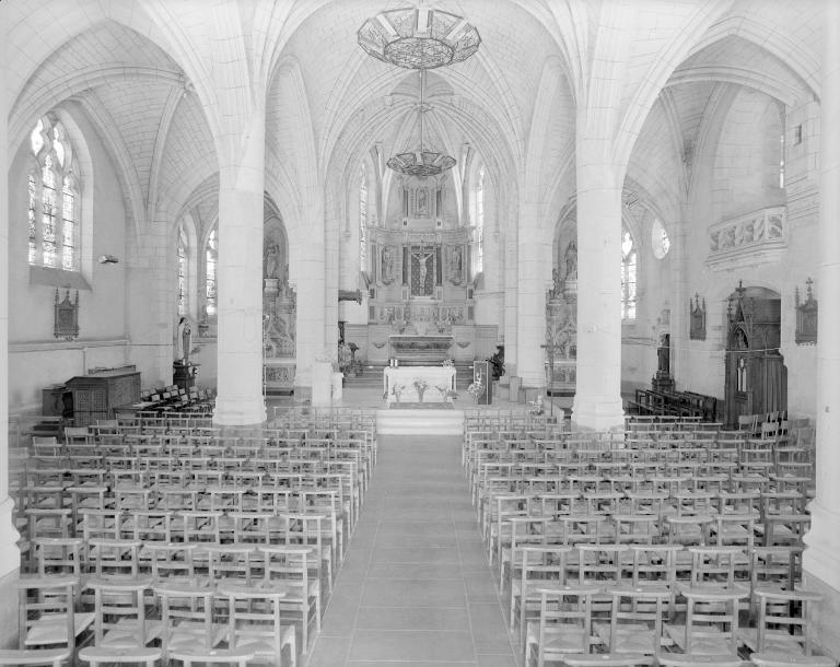 Plan allongé à trois vaisseaux, voutes d'ogives, clocher latéral, chevet à pans coupés ; style néo-gothique. Campanile en pierre de Sireuil.