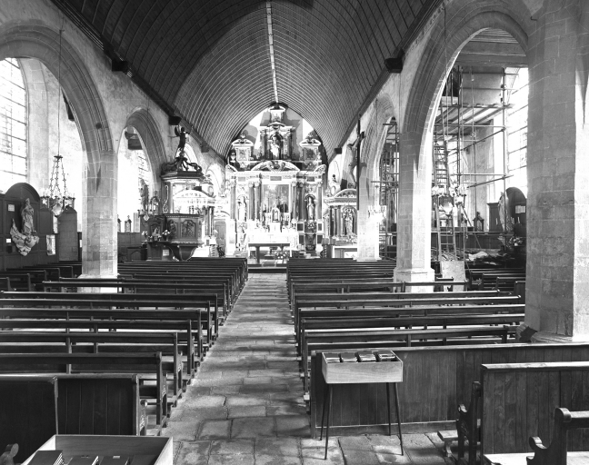 Plan allongé à trois vaisseaux, lambris de couvrement, clocher latéral accolé à la façade principale, façade latérale à pignons multiples, porche, chevet plat, toit à longs pans, pignon découvert, flèche polygonale ; sacristie à étage. A noter le décor sculpté.