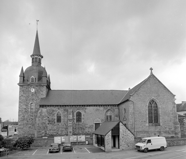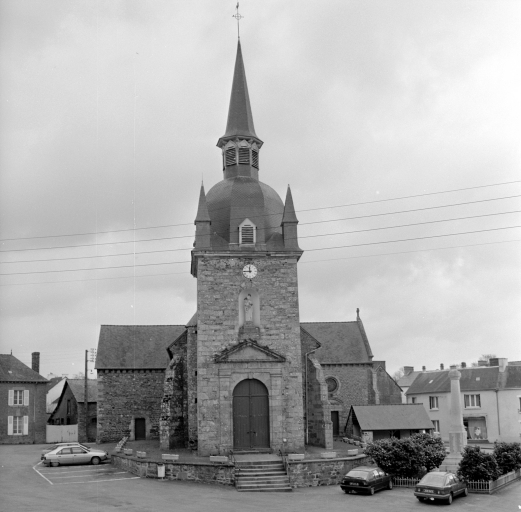 Eglise de fondation romane (vestige mur nord de la nef) relevée au 15e siècle. La porte ouest du bras nord du transept provient de la chapelle de La Heuzelaye. Clocher et bras nord du transept construits vers 1830. Un ossuaire, attesté par un dessin de 1848, était accolé au mur sud de la nef. Reconstruction partielle de l'église en 1869 par l'architecte Jean-Marie Commereuc à la suite d'un incendie qui détruisit le choeur, le bras sud du transept et la sacristie. Décor peint daté 1977.