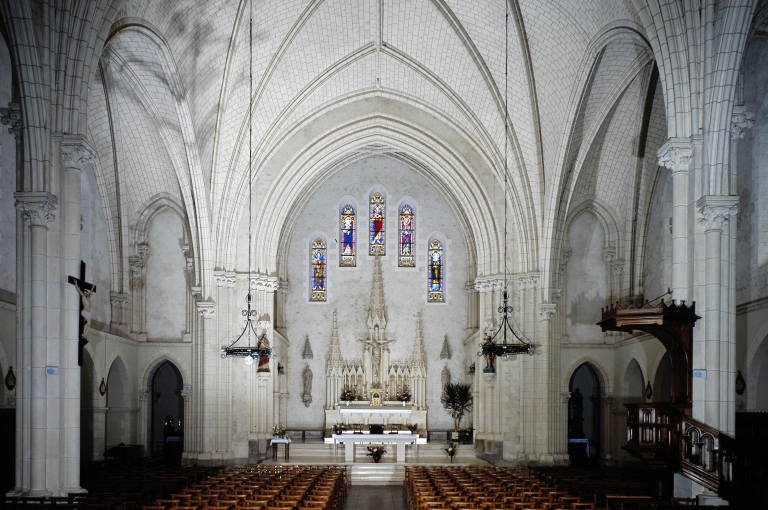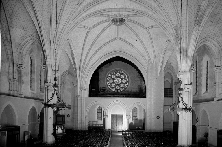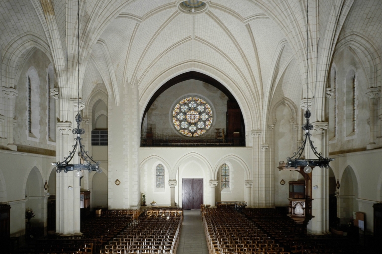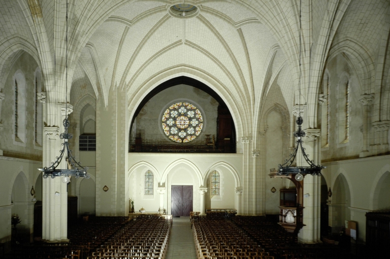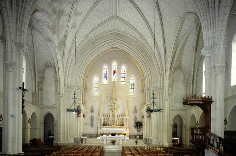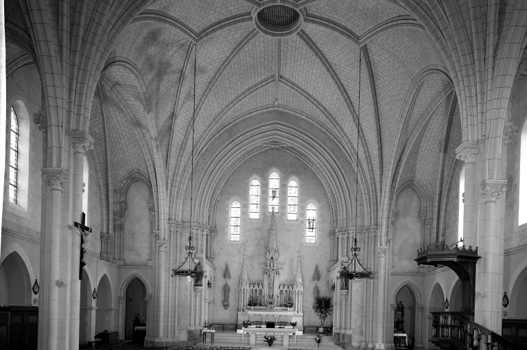 Plan allongé, voûte d'ogives, clocher latéral, chevet plat.