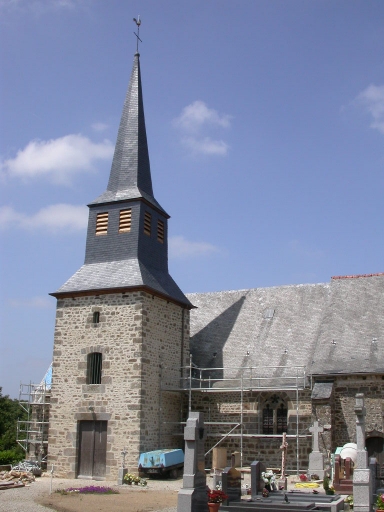 L´église à l´origine priorale dépendait de l'abbaye Saint-Melaine de Rennes. Elle est mentionnée dès le 12e siècle et devient paroissiale en 1411. De la construction originelle subsistent des vestiges d'appareillage ancien, l´église ayant été reconstruite au 15e siècle pour la nef et au 16e siècle pour le chœur. La porte sud de la nef, qui était autrefois couverte par un porche, possède un beau décor sculpté de feuilles de chêne parmi lesquelles se situent des initiales F et A. Ces dernières ont été identifiées comme étant celles du sculpteur F. André qui travaille également à l´église de Saint-Gondran. Dans le choeur, subsiste sur une sablière l´inscription suivante : JE FU FAICTE AU MOIS DE DECEMBRE 1564 TRESORIEE . ALLAIN JUDIER, J MOREL, IHS, la date de 1565 est également inscrite sur le meneau de la maîtresse vitre. Au 17e siècle se construit une sacristie contre le mur nord du chœur. Cette dernière a été agrandie et transformée en 1897. Le pignon ouest a été repris en 1803, la tour clocher quant à elle a été élevée en 1821. Elle a été construite par Ambroise Thibault, maçon de son état. Parmi les derniers remaniements signalons la réfection du chevet en 1923 et les travaux intérieurs actuels, en cours de restauration.