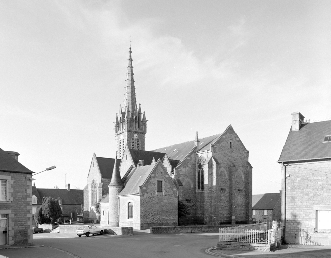 Eglise actuelle construite à l'emplacement d'un ancien édifice qui datait principalement des 16e et 17e siècles, la façade occidentale ainsi que le choeur avaient été remaniés au 18e siècle et le reste de l'édifice en 1838. La nouvelle église, en place aujourd'hui, est une construction néogothique de 1913 de l'architecte Arthur Regnault. Ce dernier dessine également le mobilier liturgique. Les vitraux sont signés Alleaume de Laval.