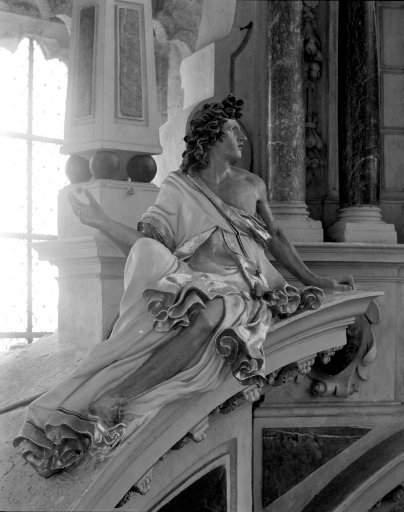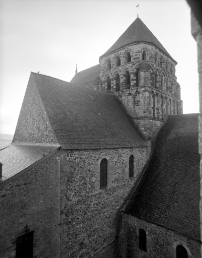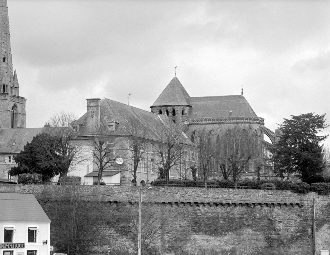 La vue du chœur depuis le nord montre que ce dernier a été construit tangent à l’enceinte urbaine, exactement à l’endroit où le rempart, parallèle à l’abbatiale, faisait un coude pour s’infléchir vers le sud et rejoindre la Vilaine. Cette position défensive importante, au point le plus haut de la ville, dominant la rivière et les marais, est représentée sur un manuscrit de 1543 dessiné en vue d’un projet d’aménagement et de canalisation de la Vilaine. La configuration particulière du site, une position défensive exposée à l’angle nord-est de l’enceinte de la ville, a sans doute entraîné le choix rare en Bretagne, hormis l’exemple du chœur de Saint-Mathieu-de-Fineterre, d’un extrados en couverture formant terrasse pour couvrir la couronne des chapelles, évitant d’offrir aux incendies des toitures en charpente.