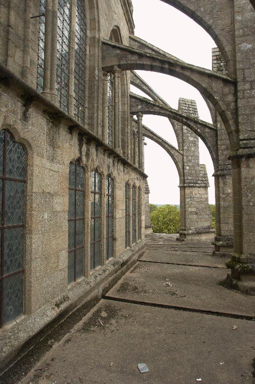 La composition pyramidale du chœur apparaît comme une réussite d’harmonie et d’équilibre. La couronne de chapelles rayonnantes tangentes les unes aux autres qui forme un socle ondulant unitaire, le triforium traité comme un bandeau continu que n’interrompt aucun redent ni ressaut, enfin les fenêtres hautes de l’abside avec leur réseau tréflé sont autant d’éléments qui rappellent, dans une version épurée, le chevet de la basilique de Saint-Denis, un des grands modèles pour les architectes de la seconde moitié du XIIIe siècle. Même s’il faut sans doute imaginer sur la couronne des chapelles un garde-corps semblable à la ligne de quadrilobes qui coiffe le vaisseau central, l’économie de la modénature et du décor sculpté, conforme à celle rencontrée à l’intérieur de l’édifice, renforce ici la clarté du discours architectural. Les culées des arcs-boutants à double volée édifiées au-dessus des piles d’entrée des chapelles rayonnantes et non, comme il est habituel, à l’aplomb du mur extérieur, de même que la saillie en angle obtus entre les chapelles de l’importante masse de mur plein qui les sépare, témoignent de la capacité de l’architecte de Redon à adapter les grands modèles. Les culées en éperon à deux ressauts, forme employée sur le côté nord du chœur de Dol, et dont le modèle vient probablement du chevet de Coutances, sont ici parfaitement adaptées à des arcs à double volée, et leur construction étagée et en retrait, palliant tout devers, témoigne d’une meilleure maîtrise dans le contrebutement. L’intrados des arcs eux-mêmes, soigneusement chanfreiné, vient descendre sous forme d’un dosseret à angles abattus au revers des culées. Au niveau des fenêtres hautes, une colonne adossée et trois colonnettes détachées sous le départ de l’arc inférieur ménagent un étroit passage pour l’entretien des vitraux. Ce principe innové sur la nef de Chartres vers 1220, repris par Pierre de Montreuil vers 1240 sur la nef de Saint-Denis, et vers le milieu du siècle au chevet de la cathédrale du Mans, de même que sur la plupart des chantiers gothiques de premier plan, montre le haut niveau de culture architecturale du maître du chœur de Redon. Dans les fenêtres hautes des travées droites enfin, les arcs supérieurs, construits avec le gros-œuvre et correspondant aux têtes des claveaux des formerets, retombent au droit des arcs-boutants, nettement en retrait de l’ouverture des fenêtres ; les arcs inférieurs sont montés avec le réseau, dans un deuxième temps, dans le prolongement des piédroits des baies, et l’espace entre les deux arcs est rempli de pierraille. Loin d’être le fruit d'une maladresse, ce détail de mise en œuvre qui éclaire le déroulement du chantier et la démarche du constructeur est totalement absent dans les travées de l’abside où l’étroitesse des trumeaux fait coïncider les deux arcs. Il est en revanche accentué dans la travée droite qui précède où l’architecte a comme on l’a vu délibérément installé une baie que son arc plus aigu et son réseau tréflé rattachent visuellement à l’abside. Alors que les travées droites du collatéral sud ont conservé leur élévation originelle, celles du collatéral nord ont été doublées vers 1440 par une chapelle venant à l’aplomb du rempart, dont l’élévation participe directement à la défense de l’enceinte. Cette chapelle dont la construction est attribuée à l’abbé Yves Le Sénéchal porte l’appellation évocatrice de « chapelle au duc » qui rappelle l’attachement constant des princes bretons pour l’abbaye et les nombreux dons faits par la dynastie de Montfort, ainsi que le projet de création d’un évêché de Redon sous le duc François Ier qui s’y fit ensevelir. Elle est éclairée à l’est par une unique baie et au nord par trois baies à trois lancettes dont le réseau à flammes et mouchettes est conforme à la date donnée par la tradition historique. Au sommet de puissants contreforts à glacis sont bandés de grands arcs mâchicoulis. Le chemin de ronde qu’ils supportent, arasé lors de la réfection tardive du toit en appentis qui couvre l’ensemble, devait rejoindre la couronne des chapelles rayonnantes en contrebas à l'est, et à l’ouest, par-delà le bras nord du transept qui a conservé sa ligne de mâchicoulis, le rempart de la ville. Au XVIe siècle, une autre chapelle de plus petite dimension, vouée à Saint-Roch, est également ajoutée contre l’extrémité du bras nord du transept.
