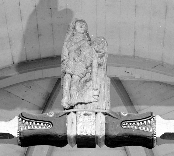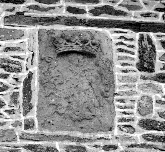 Armes martelées non identifiées, support : mur extérieur du chevet ; sujet : engoulants, support : poutre de gloire.
