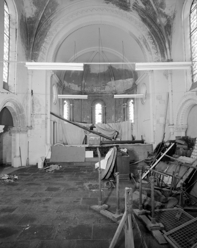 Plan allongé, voûte d'ogives, cul de four, chevet arrondi, style néo-roman.