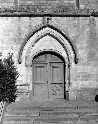 Pignons avec rampants à crochets. Grande verrière au-dessus du portail et au chevet. Chevet plat avec contreforts garnis de pinacles.
