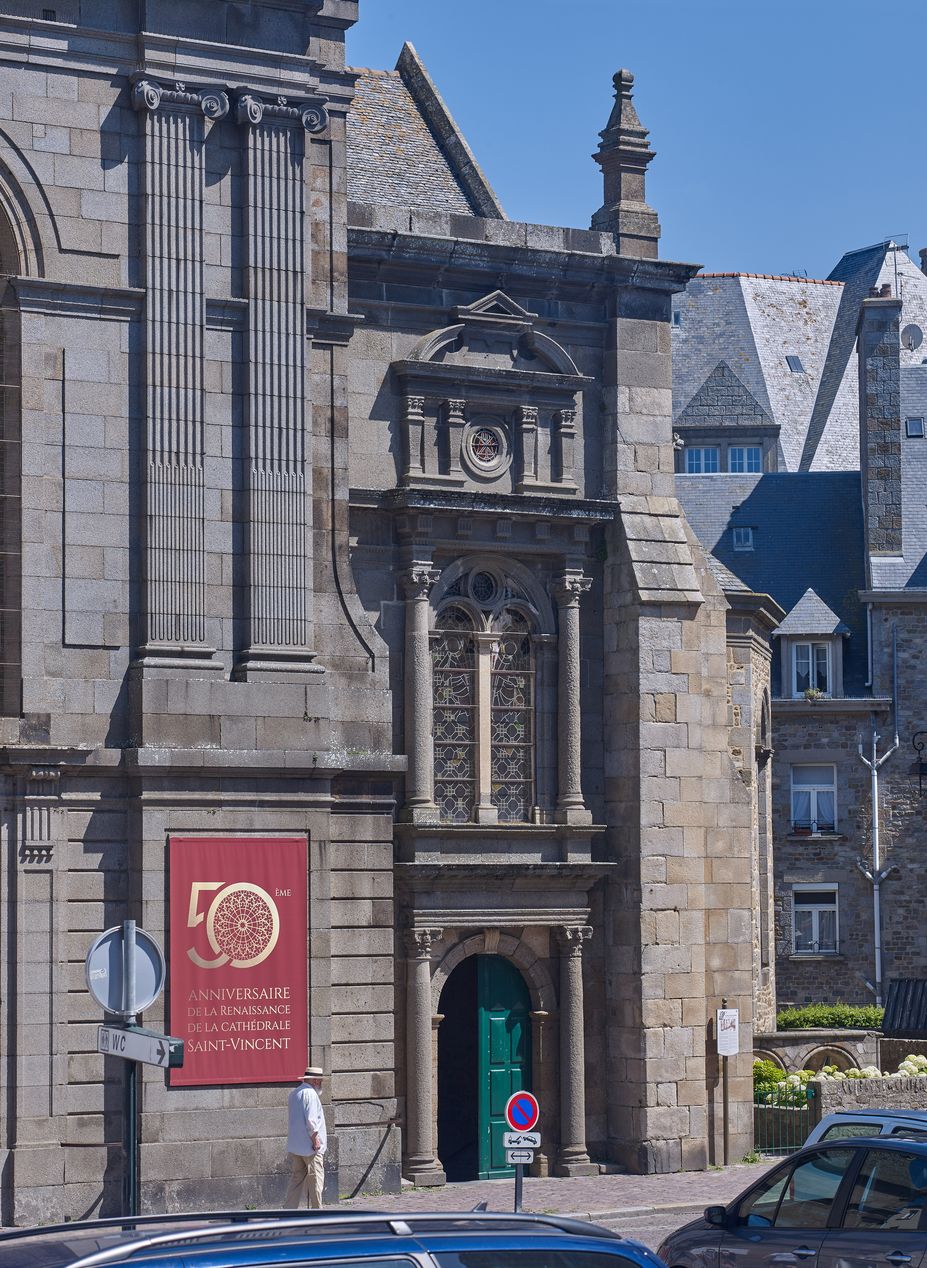 La cathédrale a été construite à l'emplacement d'une ancienne église du 7e siècle, relevée au 9e siècle et dédiée à Saint-Vincent-de-Saragosse. C'est sous l'épiscopat de Jean de Chatillon, appelée aussi Jean de la Grille (1146-1163) qu'une nouvelle église cathédrale fut édifiée et dédiée à Saint-Malo. De cette période subsistent : une partie du cloître, la nef, la croisée du transept et une travée de chacun des bras nord et sud. Le chœur, légèrement désaxé, a été reconstruit vers le milieu du 13e siècle dans le style gothique normand. La tour du clocher commencée au 12e siècle a été surélevée en 1422. Du 15e siècle date aussi le collatéral sud, comme le confirment l'enfeu ou fut inhumé Olivier Troussier en 1475, et les armes sculptées de l'évêque Jean Lespervier (1450-1485).