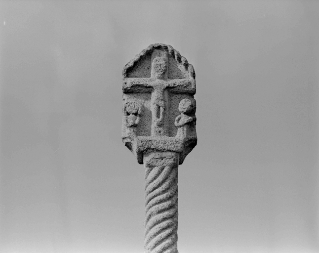 Sujet : calvaire, support : sur la face ; sujet : saint Pierre accompagné de deux personnages non identifiés, support : sur le revers ; sujet : saint Jean avec un calice, support : au bout d'une branche de la croix ; fût torsadé.
