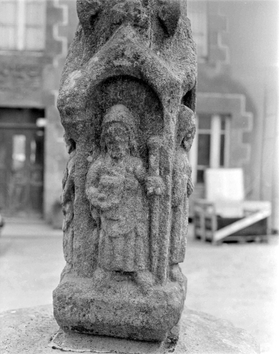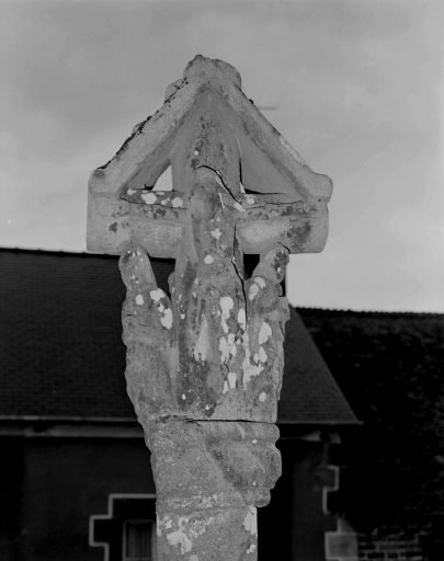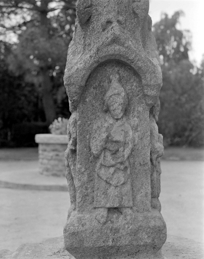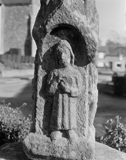 Sujet : calvaire, support : face nord de la croix ; sujet : Vierge à l'enfant couronnée avec deux anges, support : face sud de la croix ; sujet : saint Jean-Baptiste, support : face ouest du socle ; sujet : saint Jacques, support : face nord du socle ; sujet : saint Pierre, support : face est du socle ; sujet : saint Salomon de Bretagne, support : face sud du socle ; sujet : aigle de saint Jean, support : angle du socle ; sujet : homme de saint Mathieu (?), support : angle du socle ; sujet : boeuf de saint Luc (?), support : angle du socle ; sujet : lion de saint Marc (?), support : angle du socle.