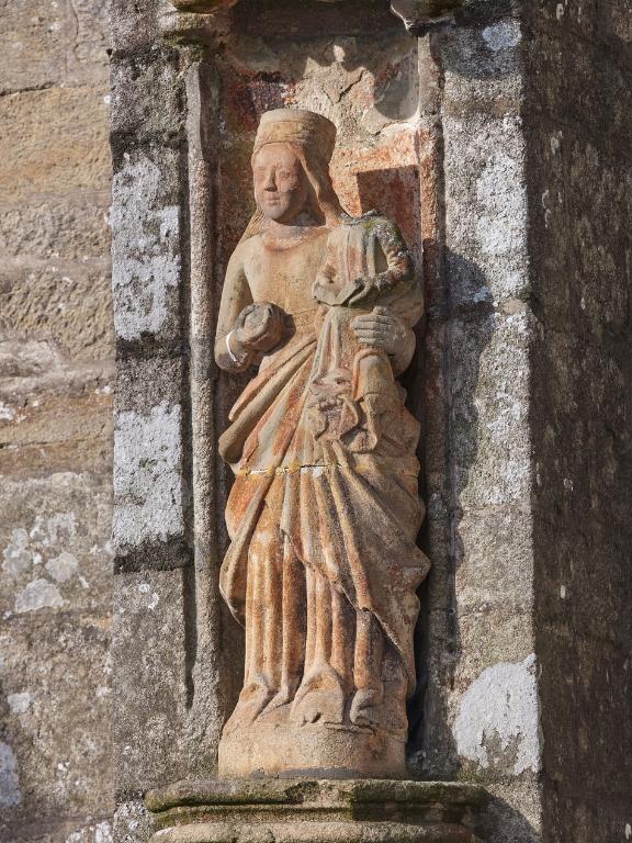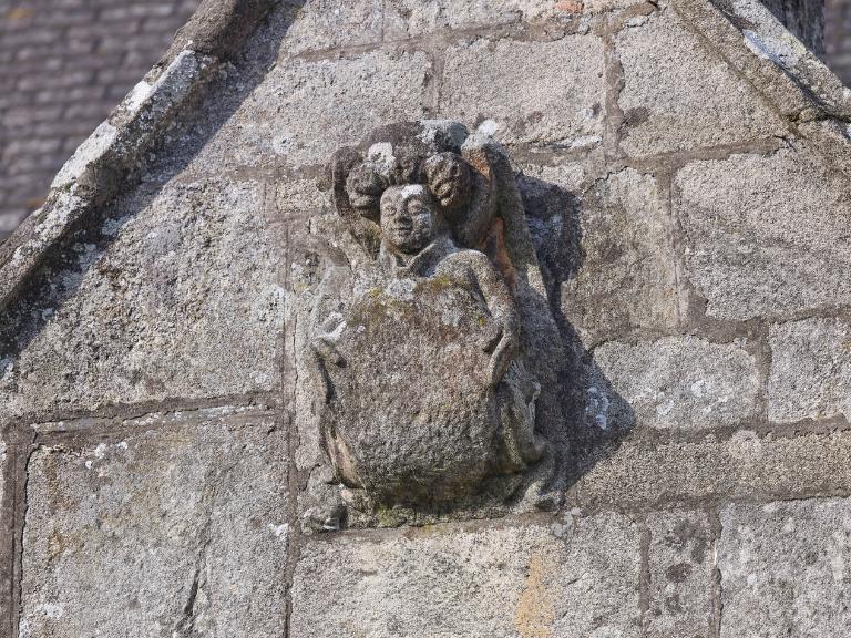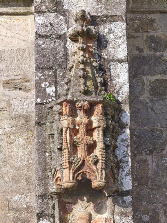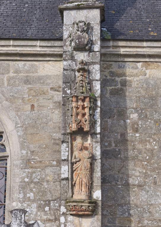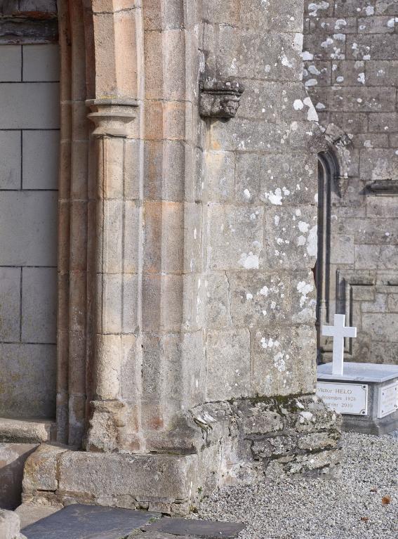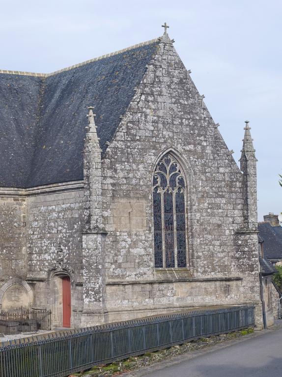 Façade sud en granite pierre de taille ; chapelle nord en schiste ; enduit partiel sur le clocher. Voûte d'ogives sur la chapelle nord Toit conique sur la tour d'escalier nord.