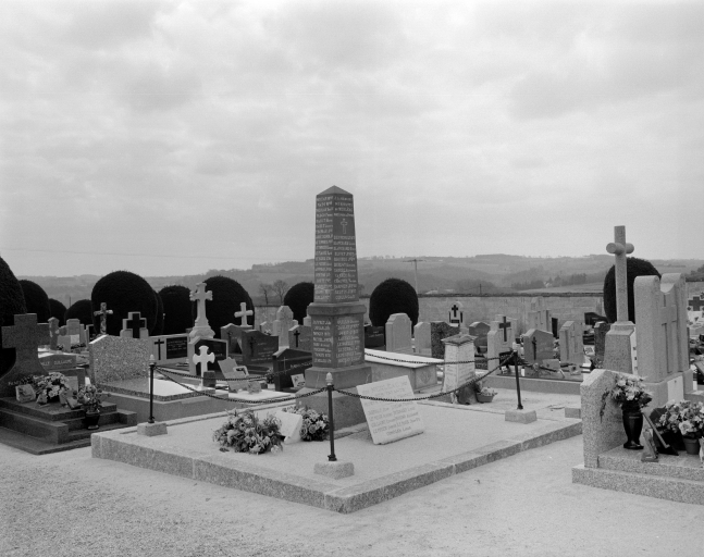 Cimetière transféré en 1873 (daté par source). Croix faite par Yves Hernot (signature) en 1873. Monument aux morts fait par F. Morvan (signature). Tombes faites par les ateliers Hernot, Balavoine, Morvan, Hue, de Saint-Brieuc.