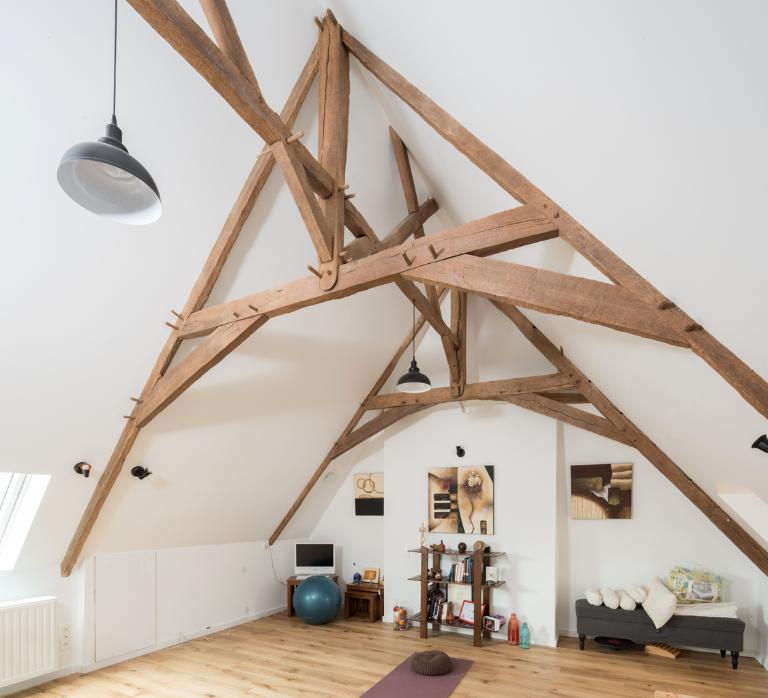 Le vestibule d'entrée occupe le centre de la maison, il contient un escalier monumental en bois, tournant à retours, construit entre deux cloisons en menuiserie. De part et d'autre du vestibule, se trouvent la salle à manger et le salon dont les lambris d'appui et de hauteur, la cheminée boisée à tablette et le plafond mouluré sont conservés. Deux portes ouvrent sur l'appentis nord, à usage de cellier au rez-de-chaussée et de chambres de domestiques à l'étage : sous l'escalier et depuis le repos de l'escalier. Depuis ce repos, un escalier secondaire à double volée dessert les couloirs qui passent derrière les chambres des maîtres pour aboutir aux étages de comble des pavillons latéraux.