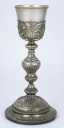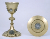 Le socle de la croix est sculpté sur trois côtés : une main, une fleur, un carré, chaque motif sous une arcade trilobée.